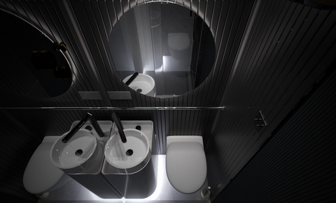 OASIS Badezimmer mit komfortabler Toilette, durch die gesamte Breite des Badezimmers und mit dem schwenkbaren Waschbecken macht es zur perfekten Lösung für alle, die gerne duschen.